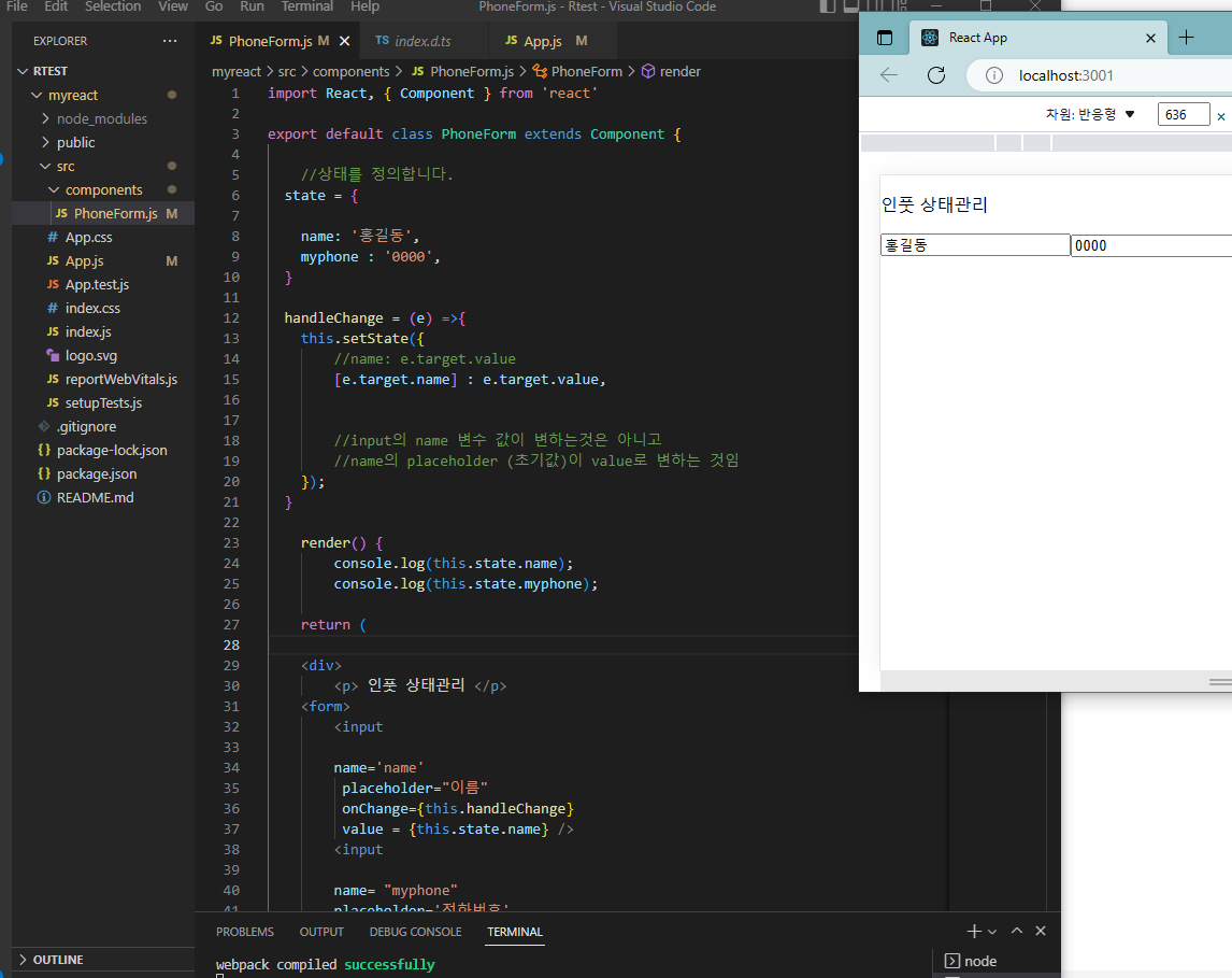 따라서, value = this.state.name 또는 myphone으로 선언해주는 것이다.